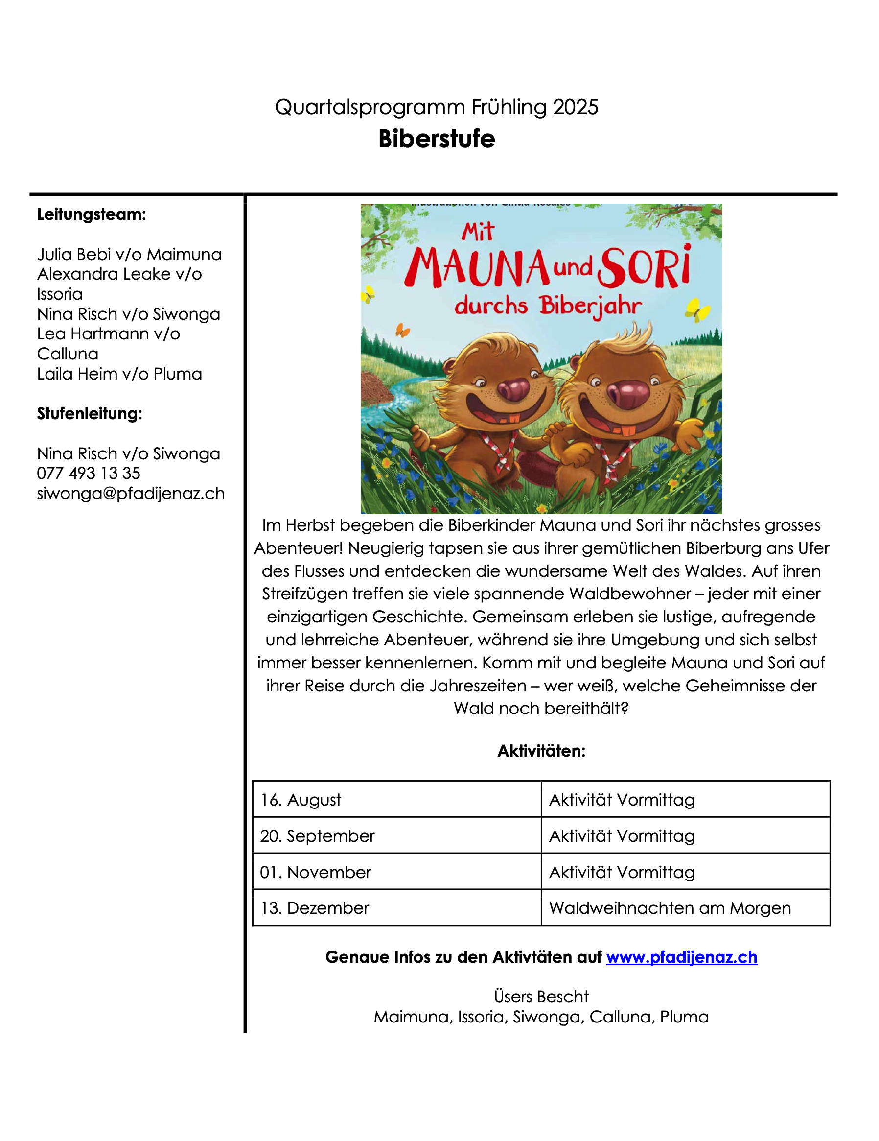 Im Herbst 2025 versuchen wir wieder die Zeiten der jeweiligen Aktivität eine Woche im Voraus zu definieren. Wir freuen uns auf ein grossartiges zweites Halbjahr zusammen mit spannenden Aktivitäten.